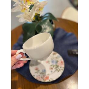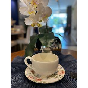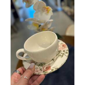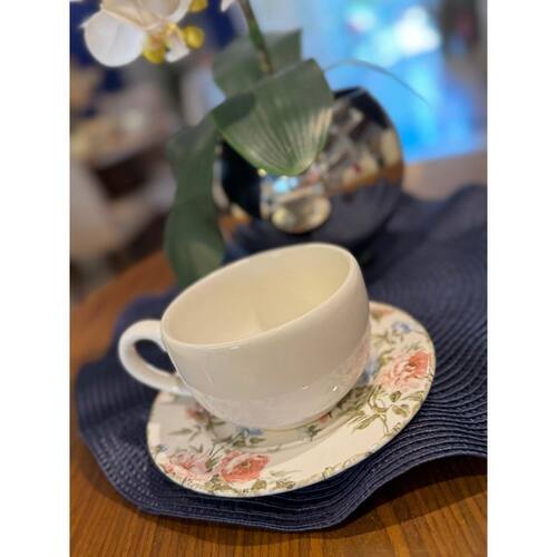 A Xícara de Chá com Pires Romântica 2 da Alleanza é feita de cerâmica feldspática branca de alta qualidade e resistência. A coleção é conhecida pelo seu design clássico e estampa floral delicada.