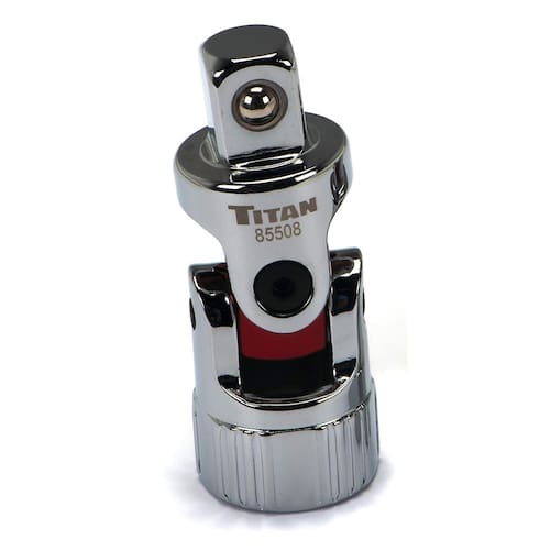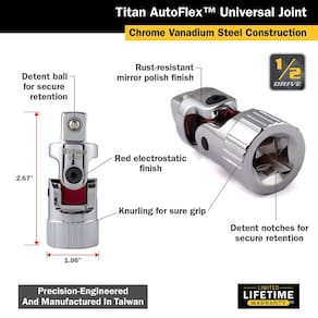 Titan 85508 Junta universal flexível de 1,27 cm - Estrutura de aço cromo-vanádio com polimento espelhado resistente à ferrugem e acabamento eletrostático vermelho - Serrilhada para aderência segura e detentora bola e entalhe para retenção segura do soquete - O adaptador universal Auto Flex é projetado para voltar ao centro - O adaptador universal articula-se sob a tensão da mola, oferecendo controle direcional e precisão semirrígidos | Chega de pendurar ou usar fita - Feito em Taiwan