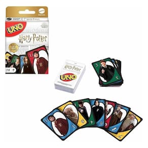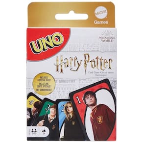 É o divertido e rápido jogo de cartas que você adora agora com personagens icônicos do mundo de harry potter junte-se a harry, hermione, ron, professor dumbledore e mais de seus personagens favoritos de hogwarts para uma noite de jogo uno. Os jogadores correm para se livrar de todas as suas cartas combinando uma carta em sua mão com a carta atual mostrada no topo do baralho. Marque pontos sendo o primeiro a se livrar de todas as cartas da sua mão. Cartas de ação especiais oferecem momentos de mudança de jogo, pois cada uma executa uma função para ajudá-lo a derrotar seus oponentes. Existe até uma carta especial de regras do chapéu seletor quando você joga esta carta, outro jogador de sua escolha deve continuar comprando cartas até encontrar uma carta da grifinória outras cartas de ação incluem skips, reverses, draw two e wild cards. Primeiro jogador ou time a 500 vitórias - e quando você tiver uma carta, não se esqueça de gritar uno um ótimo presente para fãs de harry potter, com 7 anos ou mais. Contém 112 cartões mais instruções. Para 2 a 10 jogadores com idade igual ou superior a 7 anos. As cores e decorações podem variar.