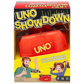 UNO Showdown é o jogo de cartas que todos amam, mas com a emoção inesperada de um smackdown de tiro de cartas! Quando o relâmpago soar e o sinal da unidade UNO Showdown disparar, seja o primeiro a empurrar a pá para baixo. O jogador mais rápido vence o confronto e envia cartas voando para fora da unidade UNO Showdown em seus oponentes! Os jogadores correm para se livrar de todas as suas cartas, combinando-as com a carta mostrada no topo do baralho. Quando os jogadores estão com uma carta, eles devem se lembrar de gritar "UNO!" Diversão para a noite de jogo infantil, familiar ou adulto e um grande presente para jogadores com 7 anos ou mais.
