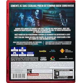 Plataforma: Playstation 4 Publisher: Sony Interactive Espaço em Disco: Min. 46GB Gênero: Terror / Aventura Quantidade de Jogadores: 1 Jogador offline Idioma: Áudio em Português / Legendas em Português Classificação Indicativa: 18 anos Conteúdo Sexual; Drogas; Violência Ano de Lançamento: -