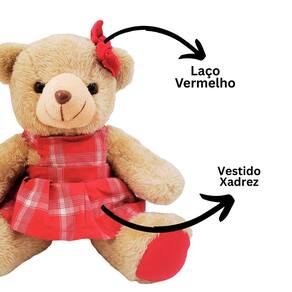 Urso Natalino Pelúcia Vestido Xadrez e Laço Vermelho 20cm