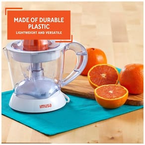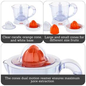 Espremedor de citrinos elétrico IMUSA com 40 Watts de potência, capacidade de 34 onças, inclui dois cones para diferentes frutas e jarra removível.Motor c/ dupla rotação