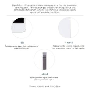 Excelente: Aparelho sem sinais de uso tela e estética 100%, arranhões leves e quase imperceptíveis. Muito Bom: Aparelho com poucos sinais de uso, tela sem arranhões e traseira podem conter arranhões, riscos e/ou amassados leves. Bom: Aparelho com diversos sinais de uso mais nítidos, como arranhões, riscos e amassados.