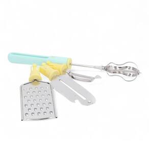Especificações: - Tipo: Conjunto de utensílios de cozinha multifuncional; - Material: Aço inoxidável + Polipropileno (PP); - Cor do cabo: Azul claro (padrão do kit); - Tamanho aproximado: 27 cm x 25 cm x 23 cm.
