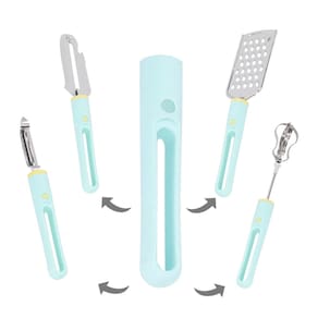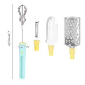 Funções incluídas: - Batedor: Mistura ovos, massas e ingredientes leves com praticidade; - Ralador: Ideal para legumes, vegetais e grãos. Tritura com rapidez e uniformidade; - Descascador com ponta de escavação: Remove cascas e imperfeições com precisão, sem desperdiçar a polpa; - Faca combinada: Utilizada para cortes e raspagem de cascas de frutas e legumes.