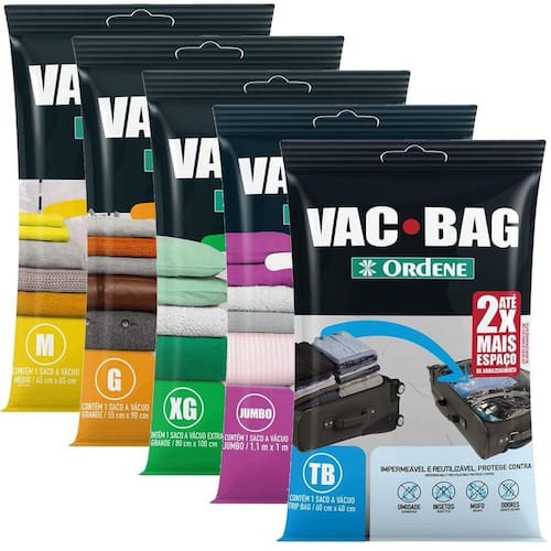 Kit 5 Saco a Vácuo Médio Grande Extra Grande Jumbo Trip Bag Kit 5 Saco a Vácuo Médio Grande Extra Grande Jumbo Trip Bag Vac Bag é a solução ideal para quem busca armazenar e organizar objetos. De forma fácil, rápida e inteligente, reduz o volume dos objetos em até 3 vezes, protegendo contra traças, insetos, mofo, poeira, sujeira, odores e umidades. Produzido em polietileno transparente, que facilita a visualização do que há em seu interior, o Vac Bag é reutilizável e ideal para todos os volumes de roupas, cobertores, edredons, travesseiros, roupas de cama, mesa e banho. Kit composto por: - 1 Saco Médio (45x65cm)- 1 Saco Grande (55x90cm)- 1 Saco Extra Grande (80x100cm)- 1 Saco Extra Grande (110x100cm)- 1 Saco Trip Bag (60x40cm) Características: - Compacto e prático, triplica seu espaço de armazenamento.- Reutilizável, organiza roupas, edredons e cobertores com muito conforto.- Impermeável, protege contra umidade, mofo, poeira, sujeira, odores e insetos.- Pode ser utilizado com aspiradores de pó ou Bomba Plástica Vac Bag (exceto modelo Trip Bag).- Material 100% Polietileno. Instruções de uso: (Exceto modelo TripBag)1. Insira na embalagem suas roupas, travesseiros, ou qualquer item que deseja guardar e proteger. As peças devem estar totalmente secas e limpas e ocupar espaço na embalagem até a linha pontilhada;2. Feche a embalagem deslizando o zíper de fechamento. O uso correto do fecho garante um resultado final com fechamento hermético;3. Abra a válvula mantendo o fecho azul na posição OPEN. Utilizando a bomba de sucção para Vac Bag, retire todo o ar da embalagem até obter o resultado desejado. Após, retire a bomba da válvula e gire o fecho azul até a posição LOCK para que a mesma se feche e garanta o vácuo. A válvula da embalagem foi projetada para adaptar-se a bomba de sução, bem como a qualquer aspirador de pó;4. Guarde na gaveta, armário ou em qualquer lugar limpo e seco. Ref. 55200 + 55400 + 55600 + 55800 + 55000 Produtos de decoração não inclusos. Imagens meramente ilustrativas.As cores dos objetos podem sofrer alterações devido a luminosidade, configurações do monitor e até mesmo a percepção do usuário.
