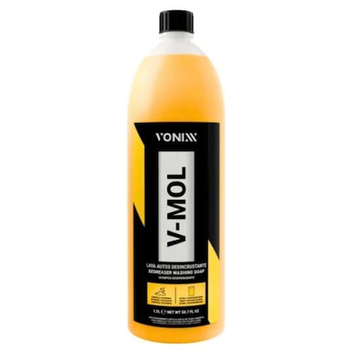 V-mol Lava Autos Desincrustante 1,5L - Vonixx V-Mol é um lava autos biodegradável com pH levemente básico que não agride a superfície. Ideal para lavagem de automóveis, em especial para remoção de sujeiras mais difíceis, como remoção de barro e óleo. Agora com aroma cereja intensa
