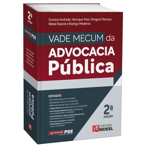 A Editora Rideel e o curso Aprovação PGE trazem o único Vade Mecum pensado exclusivamente para a carreira da Advocacia Pública. A 2ª edição do Vade Mecum Advocacia Pública ficou ainda melhor. A seleção de normas foi meticulosamente feita pelos organizadores da obra com base em editais para as provas de AGU, PFN, PGEs e PGMs. Portanto, o candidato que almeja esses cargos pode ter certeza de que este material atende todas as suas demandas. Além de beneficiar, e muito, os profissionais dessas áreas, facilitando a consulta diária a um Vade Mecum atualizado e produzido especificamente para sua carreira. DESTAQUES: CF: atualizada até a EC nº 132/2023 CC: atualizado até a Lei nº 14.754/2023 CPC: atualizado até a Lei nº 14.713/2023 Código Eleitoral: atualizado até a Lei nº 14.690/2023 Lei de Responsabilidade Fiscal: atualizada até a Lei Complementar nº 200/2023 Lei das Diretrizes e Bases da Educação Nacional: atualizada até a Lei nº 14.767/2023 Nova Lei de Licitações e Contratos Administrativos: atualizada até a Lei nº 14.770/2023 E MAIS! ATUALIZAÇÃO PERIÓDICA ON-LINE: Visando a garantir a melhor experiência possível para o leitor, a Editora Rideel disponibiliza, gratuitamente, as atualizações publicadas no DOU e DJe, até 31-10-2024, que afetem o conteúdo veiculado nesta edição, em seu site