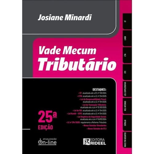 DESTAQUES: CF: atualizada até a EC nº 135/2024; CTN: atualizado até a LC nº 214/2025; Lei da Responsabilidade Fiscal: atualizada até a LC nº 214/2025; Lei da Transação Tributária: atualizada até a Lei nº 15.103/2025; Lei do ISS: atualizada até a LC nº 214/2025; Lei Kandir - ICMS: atualizada até a LC nº 214/2025; Lei Orgânica da Seguridade Social: atualizada até a Lei nº 15.072/2024; LC nº 214/2025: regulamenta a Reforma Tributária; Novas Súmulas Vinculantes; Novas Súmulas do STJ; Edição Atualizada até 31/01/2025 A Editora Rideel, reconhecida no mercado editorial pela excelência de seus Vade-Mécuns, apresenta a 25ª edição do Vade Mecum Tributário. Sempre pensando em como facilitar ainda mais a pesquisa do leitor, a capa traz um guia referencial de pesquisa sobre a obra. Assim, basta verificar na capa a norma que deseja consultar e localizá-la nas tarjas laterais. Seu formato e projeto gráfico abrangem praticidade e modernidade, facilitando o manuseio e a consulta aos temas. Ainda, a obra mantém os diversos facilitadores: Índice Cronológico Geral; Índices Sistemático e Alfabético-Remissivo para cada Código; Índices por Assuntos da Legislação Complementar; Índice de Súmulas de Direito Tributário; Notas remissivas objetivas e diretas a outros artigos, diplomas legais e súmulas; Atualizações recentes em destaque; Indicação do número dos artigos no cabeçalho dos Códigos; Indicação das leis no cabeçalho da Legislação Complementar. Visando garantir a melhor experiência possível para o leitor, a Editora Rideel disponibiliza, gratuitamente, as atualizações publicadas no DOU e DJe, até 31-5-2025, que afetem o conteúdo veiculado nesta edição, no site www.apprideel.com.br. Esta Editora, sempre empenhada em aprimorar seus livros, permanece receptiva às críticas e sugestões pelo e-mail: sac@rideel.com.br. A autora Marca: Não Informado