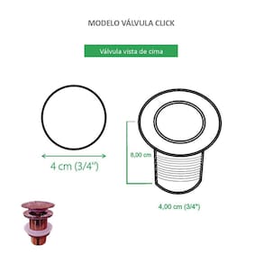 Válvula Click Rose Gold para Cuba de banheiro Esta válvula click traz a alta tecnologia sofisticação e qualidade, ideais para quem busca praticidade e eficiência. Com a função do escoamento da agua, possui um sistema rapido e simples com um clique, ela abre e fecha. Evita a entrada de insetos e do mau cheiro. Verifique as medidas do produto antes de efetuar a compra Especificações do produto: Válvula de escoamento Sistema Click Abre/Fecha ao apertar Para cubas de banheiro Não enferruja Evita o mau cheiro Evita a entrada de insetos 1 ano contra defeito de fabricação Dimensões do produto nas fotos Informações Técnicas: Marca: Reno Material: Aço Inox Formato: Redonda Cor: Rose Gold Acabamento: Brilho Atenção: Não incluso cuba e torneira. Dúvidas a Banho&Casa estará à disposição para atendê-lo de segunda a sexta das 8:30 - 17:30 hrs. Marca: Não Informado Ean: 7905376606388