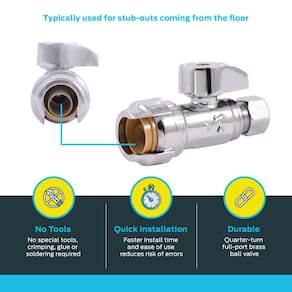 - Fácil de instalar: esta inovadora válvula de parada possui uma entrada de 1,27 cm de pressão para conectar e uma válvula esférica de latão de porta completa de um quarto de volta para operação rápida e fácil; sem necessidade de ferramentas especiais, crimpagem, cola ou soldagem; pode ser instalada em linhas molhadas