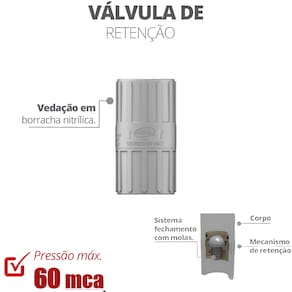 💡 BENEFÍCIOS DO PRODUTO • Retenção Segura: Desenvolvida para a retenção de fluido em refluxo de tubulações. • Vedação de Alta Segurança: Sistema de vedação em borracha nitrílica, proporcionando maior segurança no acionamento. • Alta Resistência: O corpo e filtro são fabricados em ABS, garantindo alta resistência a impactos e durabilidade. • Hidrodinâmica Otimizada: Êmbolo com formato de gota e contornos arredondados que melhora a hidrodinâmica, reduzindo a perda de carga no fluxo. • Funcionamento Automático: Opera automaticamente pela velocidade e pressão do fluxo.