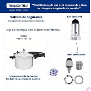 Nosso empenho é procurar o que há de mais atual e funcional no mundo culinário e para organização da sua casa, priorizando sempre a qualidade e a versatilidade dos produtos. Extremamente reforçado, garantido a segurança da panela . Modelos: 62676/220 Material: metal, baquelite Embalagem contém: 1 válvula de segurança tramontina allegra 6l item desmontado - antes de cozinhar, verifique seu equipamento; - não sobrecarregue sua panela; - mantenha sempre os cuidados necessários para o bom funcionamento; - limpe-a corretamente; - use sempre produtos de qualidade. Manutenção em dia= panela segura. Gostou Esse produto pode ser seu aguardamos sua compra Marca: Não Informado
