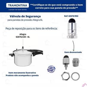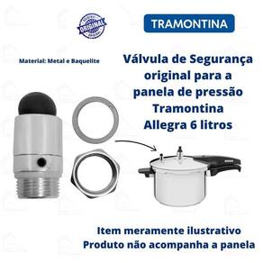 Nosso empenho é procurar o que há de mais atual e funcional no mundo culinário e para organização da sua casa, priorizando sempre a qualidade e a versatilidade dos produtos. Extremamente reforçado, garantido a segurança da panela . Modelos: 62676/220 Material: metal, baquelite Embalagem contém: 1 válvula de segurança tramontina allegra 6l item desmontado - antes de cozinhar, verifique seu equipamento; - não sobrecarregue sua panela; - mantenha sempre os cuidados necessários para o bom funcionamento; - limpe-a corretamente; - use sempre produtos de qualidade. Manutenção em dia= panela segura. Gostou Esse produto pode ser seu aguardamos sua compra