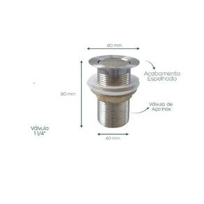 ====== Dimensões: - Diâmetro inferior 1 ¼” – 4 cm – 40 mm - Tampa click: 6 cm de diâmetro - Altura: 8 cm - Para cubas com furação entre 4 cm - 4,5 cm de diâmetro Para sifão universal Acabamento: Espelhado Cor: Inox