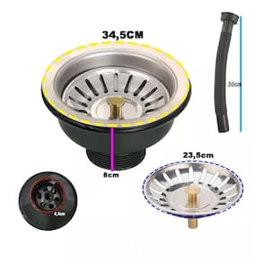 Diâmetro da válvula: 11cm Circunferência da válvula: 34,5cm Diâmetro do furo da válvula para pia: 4,5cm Circunferência do furo da válvula para pia: 14cm Altura/comprimento da válvula: 8cm Diâmetro do Cesto de Escoamento: 7,5cm Circunferência do Cesto de Escoamento: 23,5cm Sifão extensível Mínimo: 30cm Máximo: 60cm Largura do sifão: 3,5cm Diâmetro do Adaptador do sifão: 5cm Circunferência: 15cm Saída do sifão: 3cm