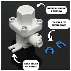 Válvula universal redutora de pressão para filtros purificadores de água de 1/4 de polegada. Garante fluxo estável e controlado, protegendo o sistema de filtragem contra pressões excessivas. Compatível com ampla gama de sistemas de filtragem. Prolonga a vida útil dos componentes internos.Bica móvel