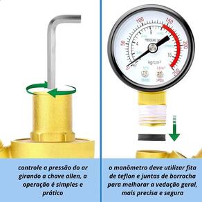 Especificações Técnicas: - Modelo: Vrp Tk- 905 - Material do corpo: Latão hpb57-3 - Diâmetro nominal: 1/2 polegadas - Extremidades: Rosca gás bsp ff - Saída para manômetro: Flp 1/4 manômetro incluído - Faixa de regulagem: 1 a 16 bar 250 psi - Compatibilidade: Água - Temperatura de trabalho: -10ºC a 110ºC - Pressão máxima de trabalho: 10 bar pn16
