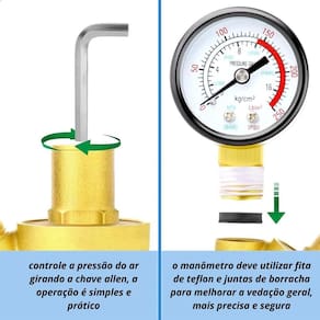Especificações Técnicas: - Modelo: Vrp Tk- 905 - Material do corpo: Latão hpb57-3 - Diâmetro nominal: 1/2 polegadas - Extremidades: Rosca gás bsp ff - Saída para manômetro: Flp 1/4 manômetro incluído - Faixa de regulagem: 1 a 16 bar 250 psi - Compatibilidade: Água - Temperatura de trabalho: -10ºC a 110ºC - Pressão máxima de trabalho: 10 bar pn16