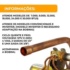 Ciclo: Quente e Frio Voltagem: 127v e 220v - 4 Vias - 3 Saídas de 1/2 - 1 Saída de 3/8 - Acompanha a Bobina - Convencionais e Inverter (modelo inverter é necessária adaptação na bobina) - 7.000, 9.000, 12.000, 18.000, 24.000 e 30.000 Btus - Universal