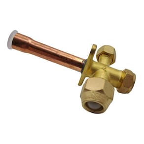 Esta válvula de serviço possui conexões de linha e manômetro, haste de válvula e conexão ao compressor. Todos os elementos, como fluídos e gases, são passados através da tubulação, e a válvula fica estrategicamente posicionada próximo a esses tubos.