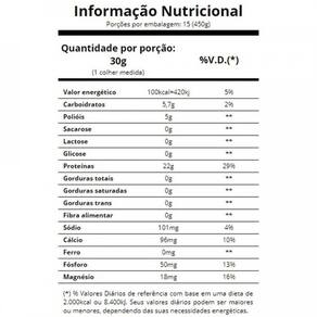 informações nutricionais porção de 30g (1 scoop) valor energético 100 kcal carboidratos 5,7g polióis 5g sacarose 0g lactose 0g glicose 0g proteínas 22g gorduras totais 0g fibra alimentar 0g sódio 101mg cálcio 96mg fórsforo 50mg magnésio 18mg quanto tempo dura 30 dias. anvisa: registro isento conforme resolução rdc 27 de 06 de agosto de 2010 anexo i.