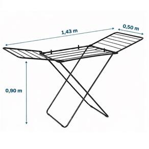 ESPECIFICAÇÕES TÉCNICAS Tipo: Varal de Chão com Abas Material: Aço Carbono Acabamento: Pintura Epóxi Poliéster Capacidade Linear: 9,8 metros de varal Carga Máxima: 12 kg Configuração: Estrutura Dobrável Articulada Comprimento Aberto: 1,43 m Largura: 0,50 m Altura: 0,90 m Peso Líquido: 990 g Preto Ambiente Recomendado: Interno e Externo Diferencial: Abas de expansão lateral