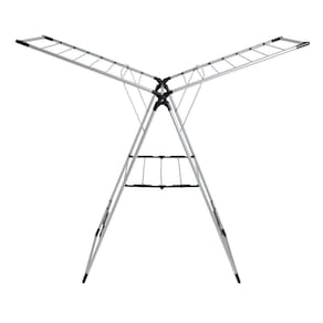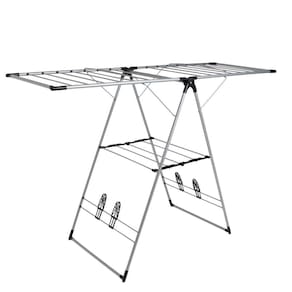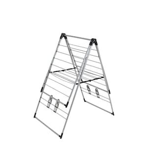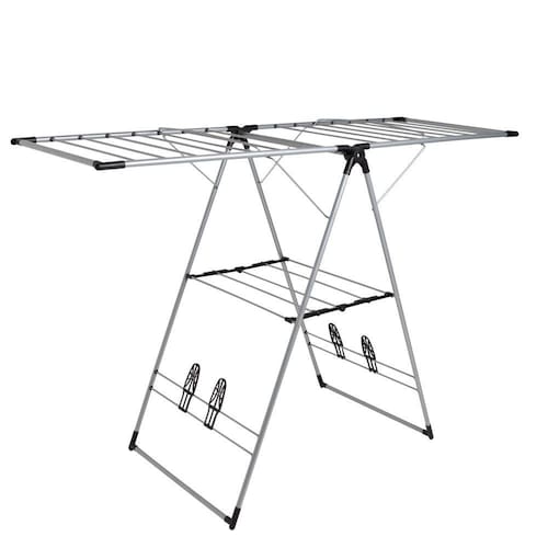 Você não precisará abrir mão da praticidade com o Varal de Chão Master Aço. Produzido em aço com pintura epóxi a pó e ponteiras em polipropileno, é resistente e durável, com capacidade para 14 metros ou 15 Kg de roupas úmidas distribuídas uniformemente. É dobrável, podendo ser guardado em qualquer cantinho, ideal para quem tem pouco espaço em casa ou no apartamento. Conta, também, com suporte em polipropileno para dois pares de sapatos, facilitando ainda mais na hora da secagem. Possui duas abas com altura ajustável, atingindo até 1,30m, sendo recomendado para pendurar peças maiores, como lençóis. Simplifique seu dia-a-dia com o Varal de Chão Master Aço.Informações do fornecedor:- Dimensões: 150,0 x 58,5 x 103,0 cm.- Capacidade: 15kg.- Material: aço.- Cor: prata.
