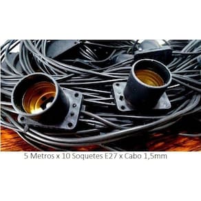 Cordão de luz 5 metros com 10 soquetes E27 preto, pronto para usar, linda decoração de festas, em varandas, áreas externas como jardim e para uso comerciais como bares, restaurantes , lojas, feiras e eventos entre outros, totalmente isolado para ligações internas e externas, ideal para uma instalação mais duradoura.