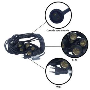Diferenciais: Compatível com lâmpadas de soquete E-27, permitindo personalização da iluminação. Extensão de 20 metros que cobre espaços amplos e variados. Instalação prática e segura, adaptando-se a diferentes ambientes. Material resistente que proporciona durabilidade durante o uso. Ideal para festas, eventos e decoração de interiores e exteriores.