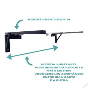 Varal De Parede Retrátil Super Reforçado O que acompanha com o varal: - 01 par de hastes dobráveis reforçadas de 50 cm. - 20 metros de cabo de aço revestido de 1,7 mm. - 06 buchas s10 com parafuso sextavado para concreto. - 02 abraçadeiras para cabo de aço Nosso varal é o mais reforçado do , não usamos cordas de nylon e sim cabos de aço revestidos Nosso produto é de altíssima qualidade, produzido em aço carbono na chapa 1,2 mm com pintura automotiva para que nossos varais tenha maior resistência contra ferrugens. Com um designe moderno e de fácil instalação, proporcionado a sua casa um aspecto muito mais bonito. Indicado para lugares apertados como corredor, lavanderia, apartamentos e etc, o varal dobrável reforçado tem como sua maior característica o ganho de espaço quando não utilizado, deixando ele com apenas 5 cm da parede/muro. Com cabo de aço revestido evitando a quebra de cordas para dar mais segurança as suas roupas. O material de fabricação é de alta qualidade. Marca: Não Informado
