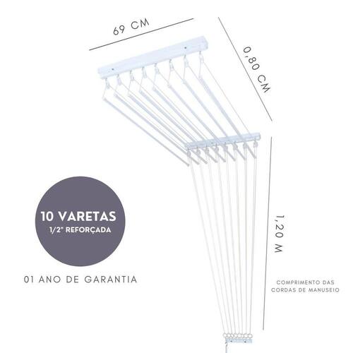 Dimensões Do Produto: Local Da Instalação: Teto Comprimento Das Varetas: 80cm Comprimento Instalado: 85cm Largura Das Bases: 69cm Quantidade De Varetas: 10 varetas Peso Suportado Da Estrutura: 30kg Peso Suportado Por Vareta: 3kg