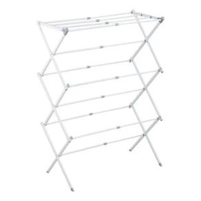 Composição: Ferro e PP Polipropileno Peso Aproximado: 2 kg Dimensões Montado: Altura: 103 cm Comprimento: 37 cm Largura: 40 cm Dimensões Fechado: 43 cm x 51 cm Cor: Branco e Cinza Capacidade: Suporta até 10 kg de roupas úmidas Varetas: 11 varetas extensíveis