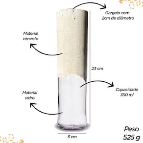 Especificações: Altura: 23 cm Largura: 5 cm Diâmetro: 5 cm Peso: 525 g Itens inclusos: 1 - Vaso decorativo de cimento e vidro Qualquer duvida estamos a disposição!