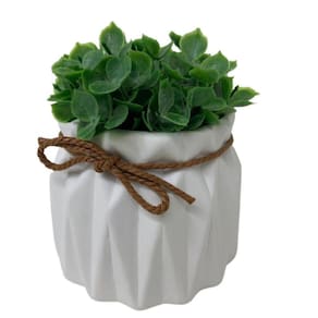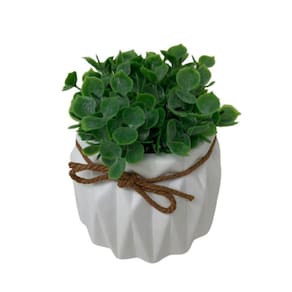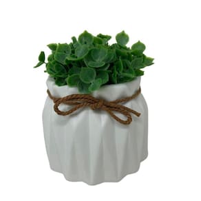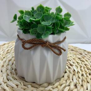 Vaso decorativo branco trabalhado de cerâmica com detalhe corda e planta artificial.