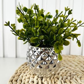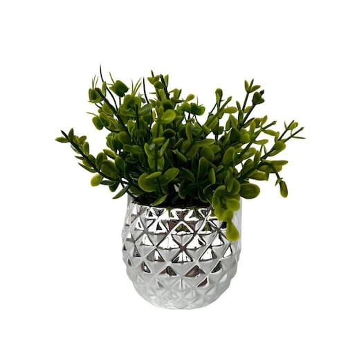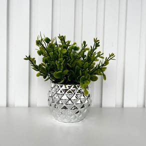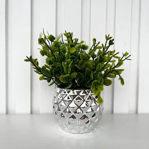 Decoração enfeite sala rack estante vaso cachepot prata de cerâmica com textura gométrica trabalhado 3D com arranjo planta artificial.