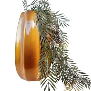 Decoração sala rack aparador vaso centro de mesa grande de cerâmica moderno trabalhado alto relevo na cor dourada decoração luxo com planta caída.