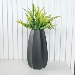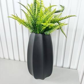 Decoração sala rack aparador vaso centro de mesa grande de cerâmica moderno trabalhado alto relevo na cor preto fosco decoração luxo com planta artificial.