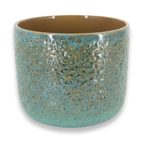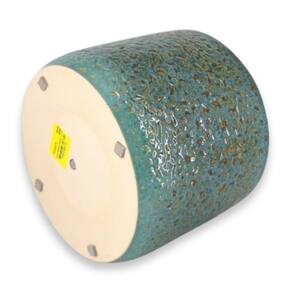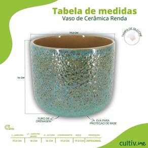 Característica * Tipo: Vaso de cerâmica esmaltado * Modelo: Renda (15) * Cor: Verde Caramelo * Altura: 14 cm * Largura superior (boca): 17,3 cm * Largura da base: 16 cm * Material: Cerâmica artesanal esmaltada * Acabamento: Brilhante com textura rendada * Furo de drenagem: Sim * EVA protetor de base: Sim * Tampa para Furo de Base Sim * Produção: Artesanal * Indicado para: Plantas naturais e artificiais, decoração interna e externa