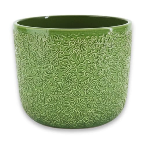 Característica * Tipo: Vaso de cerâmica esmaltado * Modelo: Renda (15) * Cor: Verde Cobre * Altura: 14 cm * Largura superior (boca): 17,3 cm * Largura da base: 16 cm * Material: Cerâmica artesanal esmaltada * Acabamento: Brilhante com textura rendada * Furo de drenagem: Sim * EVA protetor de base: Sim * Tampa para Furo de Base Sim * Produção: Artesanal * Indicado para: Plantas naturais e artificiais, decoração interna e externa