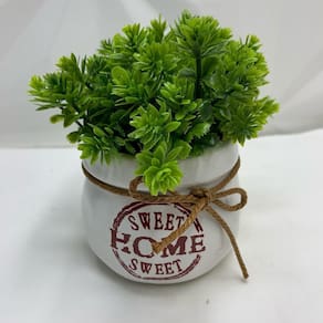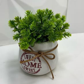Vaso de cerâmica decorativo 'Sweet Home' com detalhe corda e planta artificial.