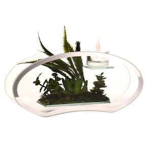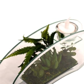 Desktop, base espelhada. Bordas do espelho de vidro frontal. Mede 12,5 cm de altura 27,5 cm de largura e 6 cm de profundidade. Arranjo de plantas verdes variadas. Led multicolorido, estilo candelabro. Para decorar todos os tipos de ambientes, como casa, escritório.