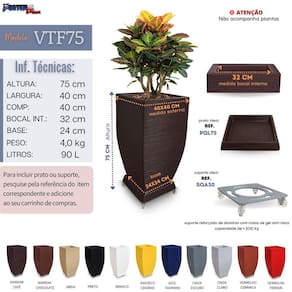 Modelo: vtf75 Altura: 75 cm Largura: 40 cm Base: 24 cm Peso: 4 kg Capacidade: 90 litros Material: polietileno ................................................................................................................................................... Grandes vantagens do polietileno