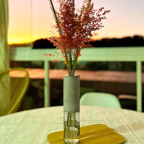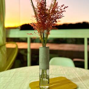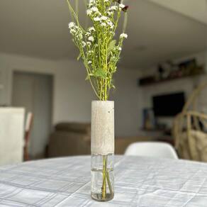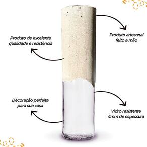 Especificações: Altura: 23 cm Largura: 5 cm Diâmetro: 5 cm Peso: 525 g Itens inclusos: 1 - Vaso decorativo de cimento e vidro Qualquer duvida estamos a disposição!