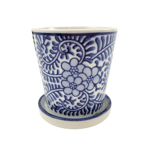 Estampa Floral Tradicional: Azul sobre porcelana branca, com acabamento brilhante. Com Furo para Drenagem: Funcionalidade ideal para plantas naturais. Pires Acoplado: Estrutura única e fixa, prática e segura para uso diário. Compacto e Versátil: Ótimo para uso decorativo em diversos espaços.