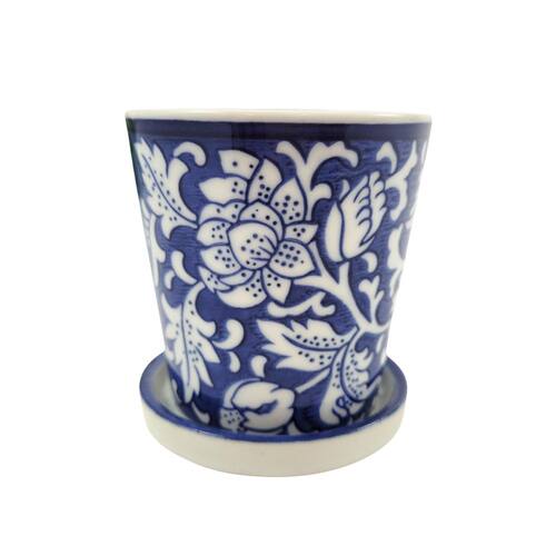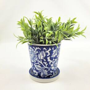 O Mini Vaso de Porcelana Arabesco Azul e Branco com Pires Acoplado é uma peça charmosa e funcional, ideal para complementar a decoração com elegância e praticidade. Com estampa em arabesco azul sobre fundo branco, seu design é inspirado no estilo clássico oriental. O pires é fixo à base do vaso, garantindo estabilidade e evitando vazamentos, enquanto o furo no fundo permite a drenagem da água - ideal para o cultivo de pequenas plantas naturais. Uma solução decorativa compacta e bem resolvida para diversos ambientes.