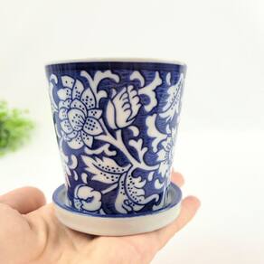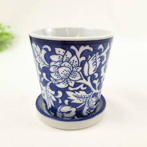 Estampa Arabesco Clássica: Visual refinado com padrão azul sobre porcelana branca. Com Furo para Drenagem: Permite uso com plantas naturais. Pires Acoplado: Estrutura única e fixa, evita vazamento e facilita o uso. Tamanho Compacto: Ideal para prateleiras, aparadores e janelas.