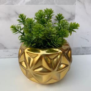 Vaso decorativo de cerâmica trabalhado dourado geométrico.