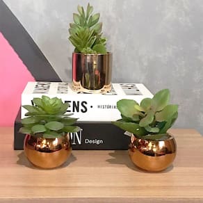 Nossa Suculenta é confeccionada em plástico siliconado, de traços finos e delicados, com aparência tão realista quanto a planta natural. O vaso foi produzido em cerâmica, um material leve, resistente e prático, em tom dourado brilhante. Essa cor dourada da peça, proporciona um toque de requinte e destaque em qualquer local.